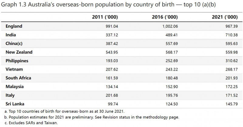 截至2021年底,出生于印度、中國、菲律賓、越南、馬來西亞和斯里蘭卡的人,已經占到澳洲總人口的8.6%,占澳洲移民群體的29.4%。
