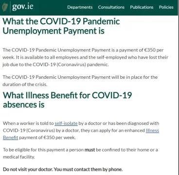 愛爾蘭福利局為所有因疫情而失去收入的員工或自雇人士每人每周發放350歐元,共計發放6周的基本補助金。申請該補助不會對簽證造成影響。社會保障部部長Regina Doherty表示已經處理了超過40,000份失業救濟金的申請,將在下周支付給申請者。
