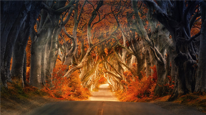 北愛爾蘭地區(qū)阿莫伊村附近有一條被譽(yù)為世界上最美樹木隧道的地方。路邊的毛櫸樹層層疊疊地排列著,形成一道樹蔭濃密、寧靜怡人的鄉(xiāng)村風(fēng)光。300多年的歷史為這條道路抹上了濃郁的歷史氣息。這就是權(quán)游中連接北境長城、君臨、風(fēng)息堡的重要交通樞紐——國王大道。