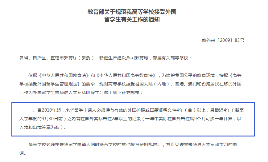 查看北京大學(xué)、清華大學(xué)過往幾年的國際生招生要求也會發(fā)現(xiàn),其中明確規(guī)定了國際生需持有效的外國護(hù)照或國籍證明文件4年(含)以上,且最近4年之內(nèi)有在國外實際居住2年以上的記錄。
