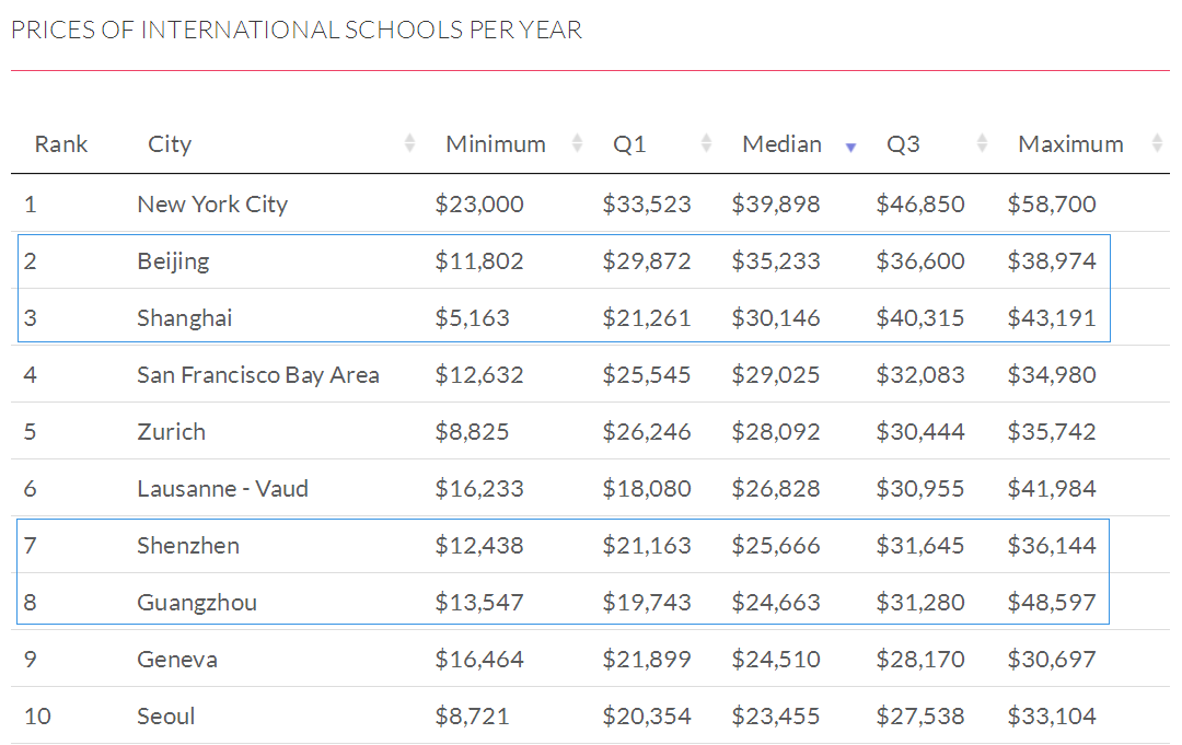 北京的國際學(xué)校中位數(shù)為35,233美元(約23萬人民幣);
