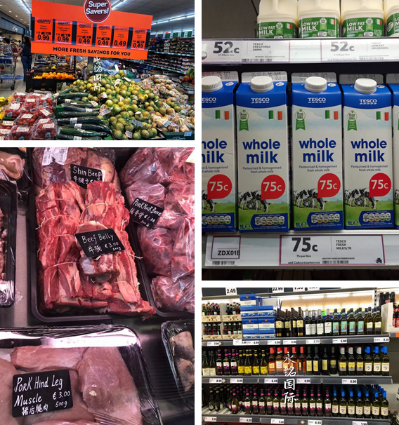 愛爾蘭超市食品種類齊全,各種肉、海鮮、蔬菜、水果、蛋、奶制品應有盡有。愛爾蘭食品的物價并不貴,1L的牛奶通常只要1歐左右,1大袋吐司面包不到2歐,900g的雞翅差不多2歐,4歐就可以買到1只雞,新鮮的三文魚500g約8歐,藍龍蝦1kg約20歐,愛爾蘭的牛羊肉品質很好,價格也適中。