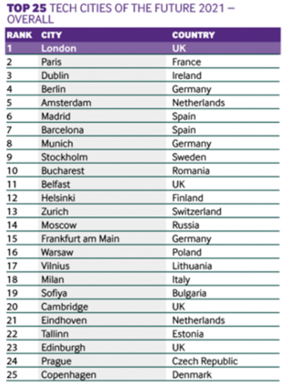 近日,fDi Intelligence聯合全球知名科技網站TNW最新發布了《2021年未來科技城市(Tech Cities of the Future 2021)》報告,該報告旨在尋找在初創、技術和創新投資方面最具廣闊前景的歐洲城市,其中都柏林從歐洲31個國家的76個城市中脫穎而出,位列城市排行榜第三名。