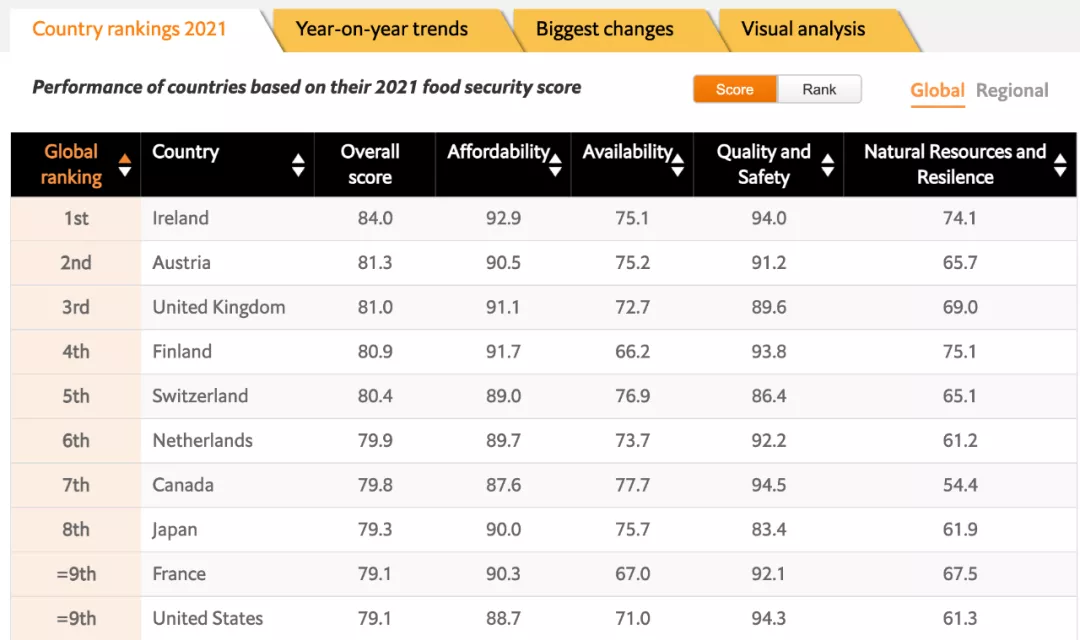近日,全球知名雜志《經(jīng)濟(jì)學(xué)人》(The Economist Group)發(fā)布了《2021全球食品安全指數(shù)》排名,愛爾蘭以84.0的綜合分?jǐn)?shù)再次摘下全球第一的桂冠!中國以71.3的綜合分?jǐn)?shù)排名全球第34位。