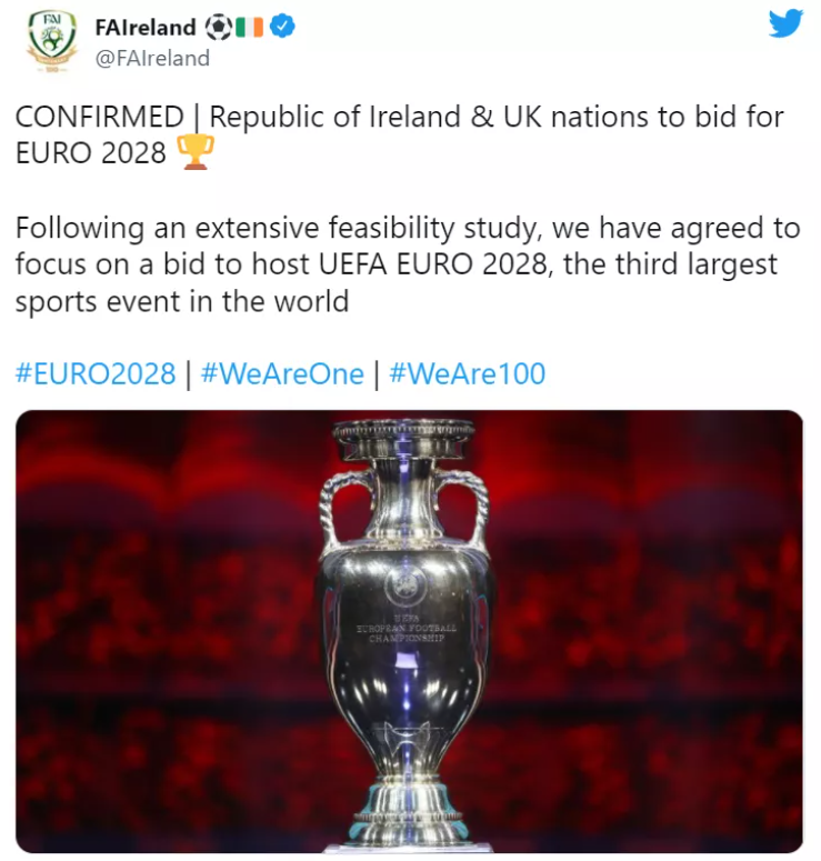 英足總表示:“我們相信英國和愛爾蘭能給歐足聯以及歐洲足球在2028年帶來一些特別的東西,一個緊湊而獨特的五方合作將為球隊和球迷帶來美好的體驗。