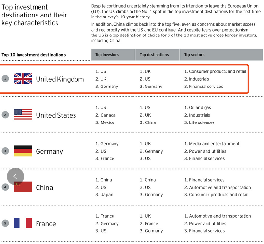 根據(jù)世界權(quán)威會計師事務(wù)所安永(EY)最新出爐的一系列數(shù)據(jù)和排名顯示,英國并沒有受到脫歐疑云籠罩,全球投資者依然對英國充滿信心。