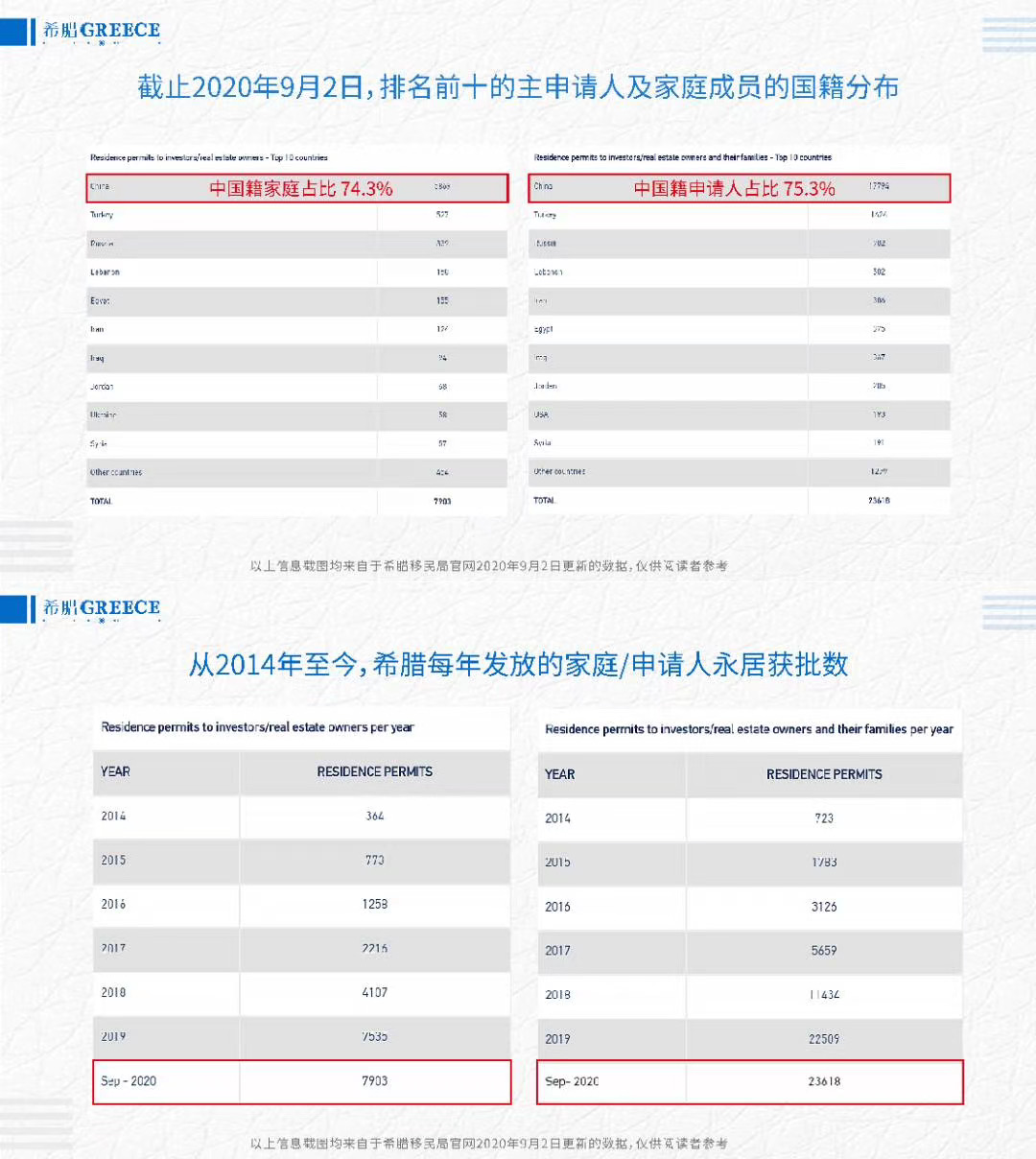根據希臘移民局發布的最新黃金簽證數據:截至2020年9月2日,希臘政府一共為主申請人簽發永久居留許可7903份,累計向31521位申請人(投資者及其附屬家庭成員)發放永居許可。