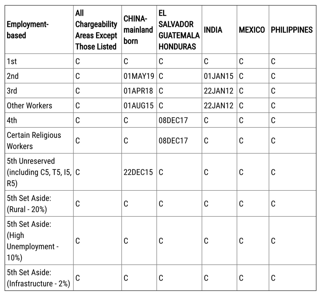 ·表B同樣除EB-2前進(jìn)1個(gè)月至2019年5月1日,其他各類(lèi)簽證項(xiàng)目排期無(wú)變化。