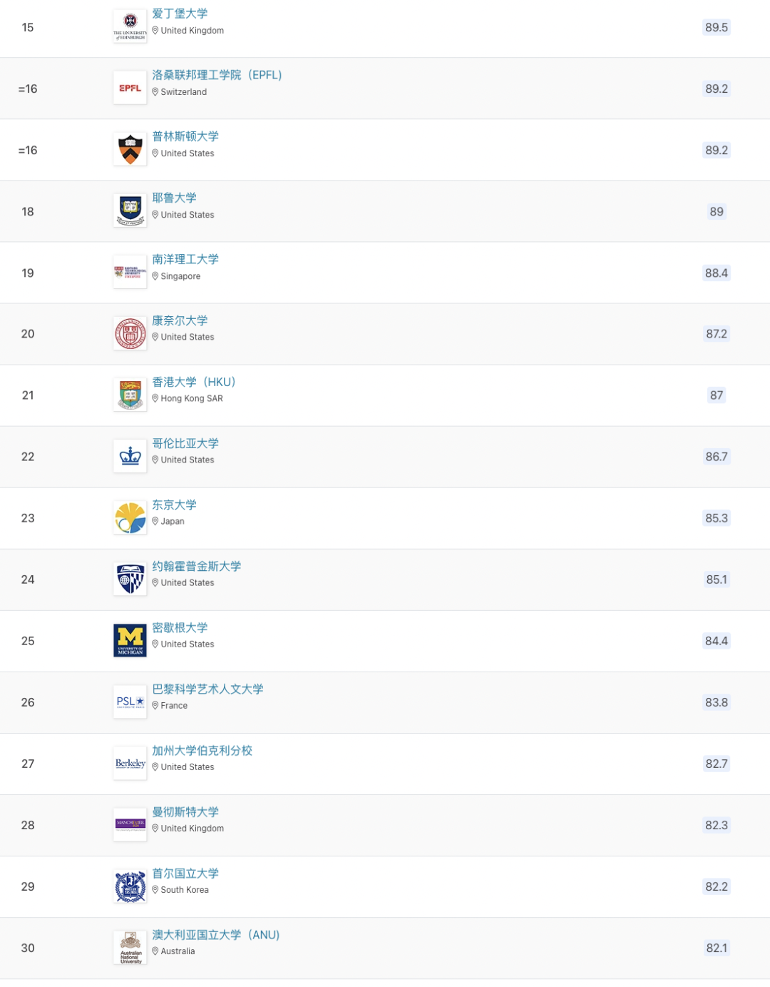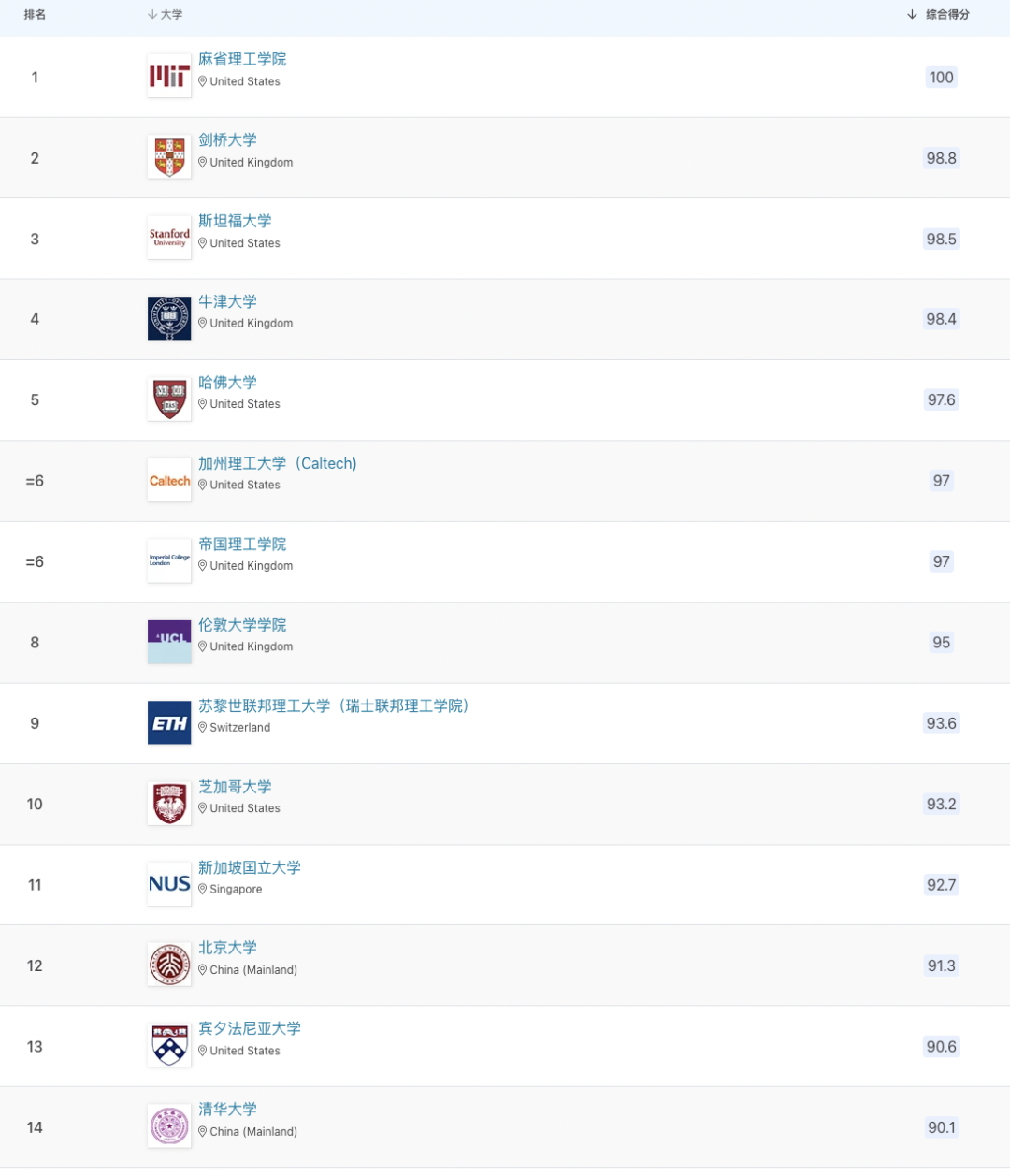 中國(guó)(大陸)目前有兩所大學(xué)進(jìn)入世界前 15 名,北京大學(xué)(第 12 名)和清華大學(xué)(第 14 名)獲得了本榜單成立以來(lái)的最高排名。