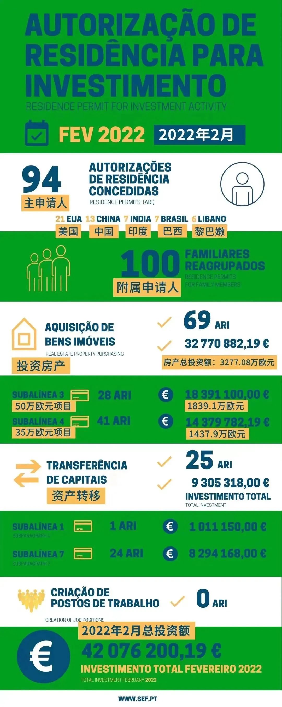 日前,葡萄牙移民局官網公布了2022年2月的黃金簽證數據。今年2月,共有94位主申請人連同他們的100位家屬獲得了葡萄牙黃金簽證。這一數據,與今年1月持平,獲批人數維持穩定。2月總投資額為4208萬歐元。