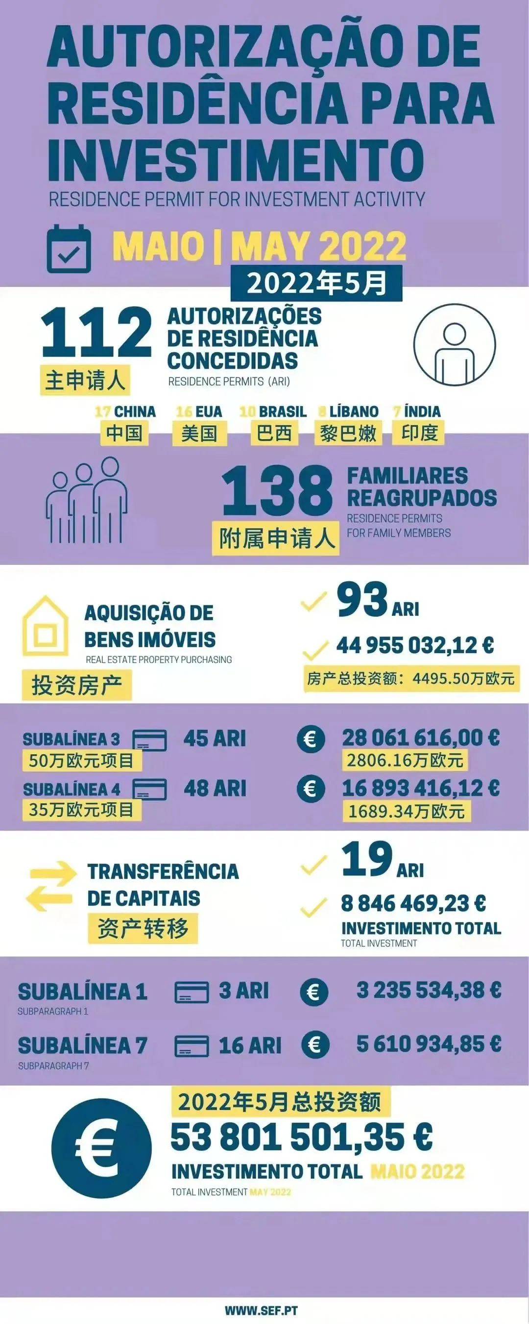 近日,葡萄牙移民局更新了5月份的黃金簽證數(shù)據(jù):2022年5月共計112位主申請人和138位附屬申請人獲批葡萄牙黃金簽證,投資額為5380萬歐元。同比4月,主申請人數(shù)略微下降,附屬申請人上升。