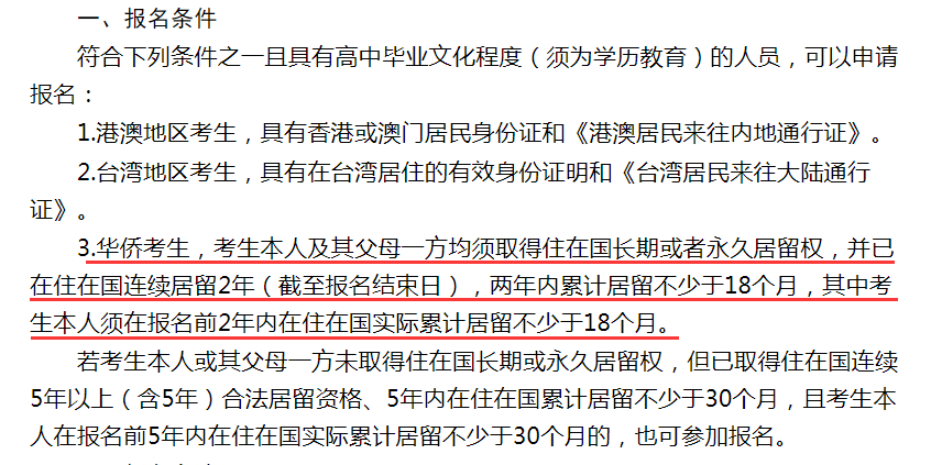 考生本人及其父母一方均須取得住在國長期或者永久居留權,并已在住在國連續居留2年(截止報名結束日),2年內累計居留不少于18個月,其中考生本人須在報名前2年內在住在國實際累計居留不少于18個月。