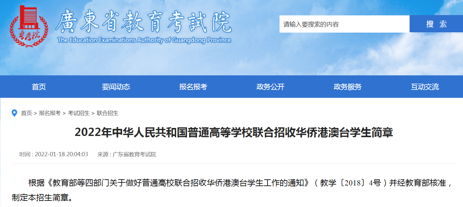 2022年1月18日,廣東省教育考試院發布了《2022年中華人民共和國普通高等學校聯合招收華僑港澳臺學生簡章》。那么,2022年華僑港澳臺學生全國聯招的報名條件、報名時間、考試科目、考試時間地點及志愿填報是怎樣的?下面我們一起來了解一下。