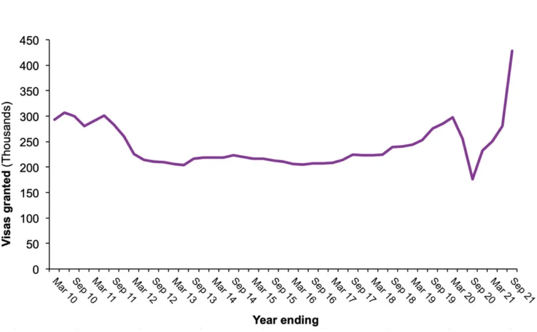 日前,英國內政部發布了最新的《學生簽證年度數據》。數據顯示,在截至2021年9月的一年中,內政部共計發放了428,428份學生簽證,創歷史新高!同比2020年暴增143%,比疫情前的2019年高出55%。
