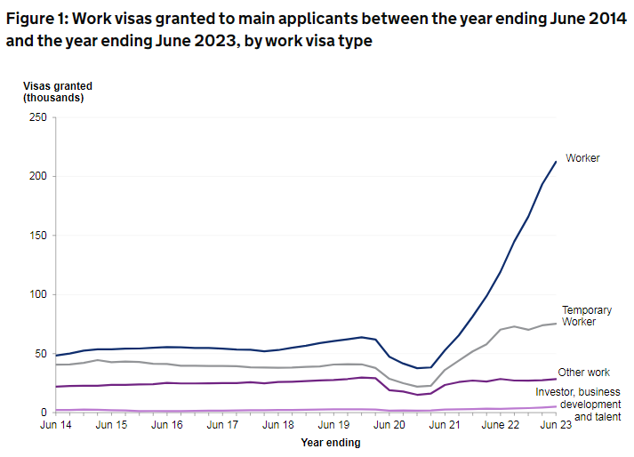 英國內政部的官方數據顯示:在截至今年6月的一年里,英國發放了近54萬份工作簽證(包括家屬在內)。相比2022年同期大增63%,工作簽證一躍成為全球移英家庭的新寵”