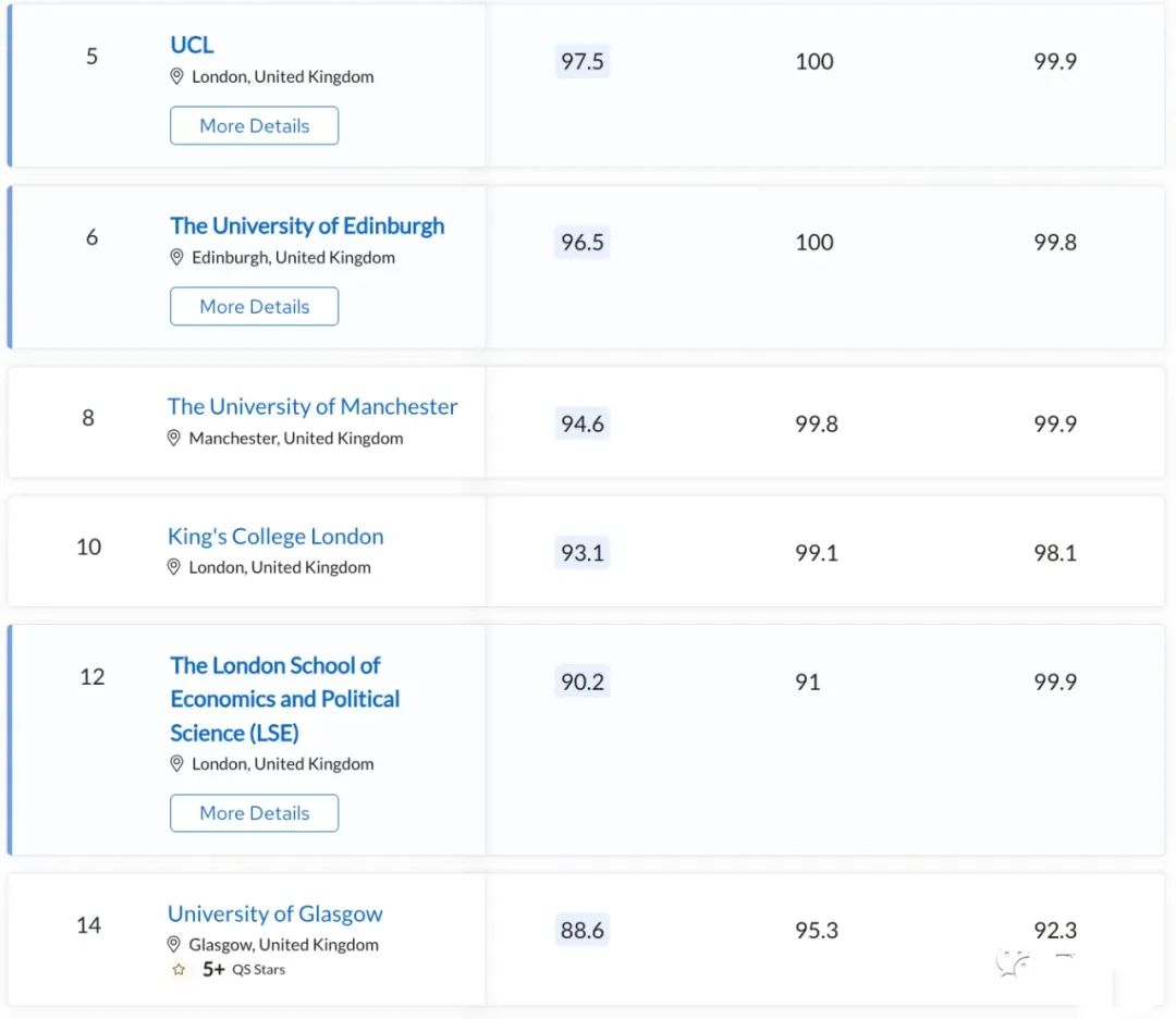 而縱觀2024 QS歐洲大學(xué),英國大學(xué)不僅上榜數(shù)量最多,排名也非常靠前,在歐洲Top10中英國大學(xué)包攬了7席!分別是:牛津,劍橋,帝國理工,UCL,愛丁堡,曼大,倫敦國王學(xué)院。